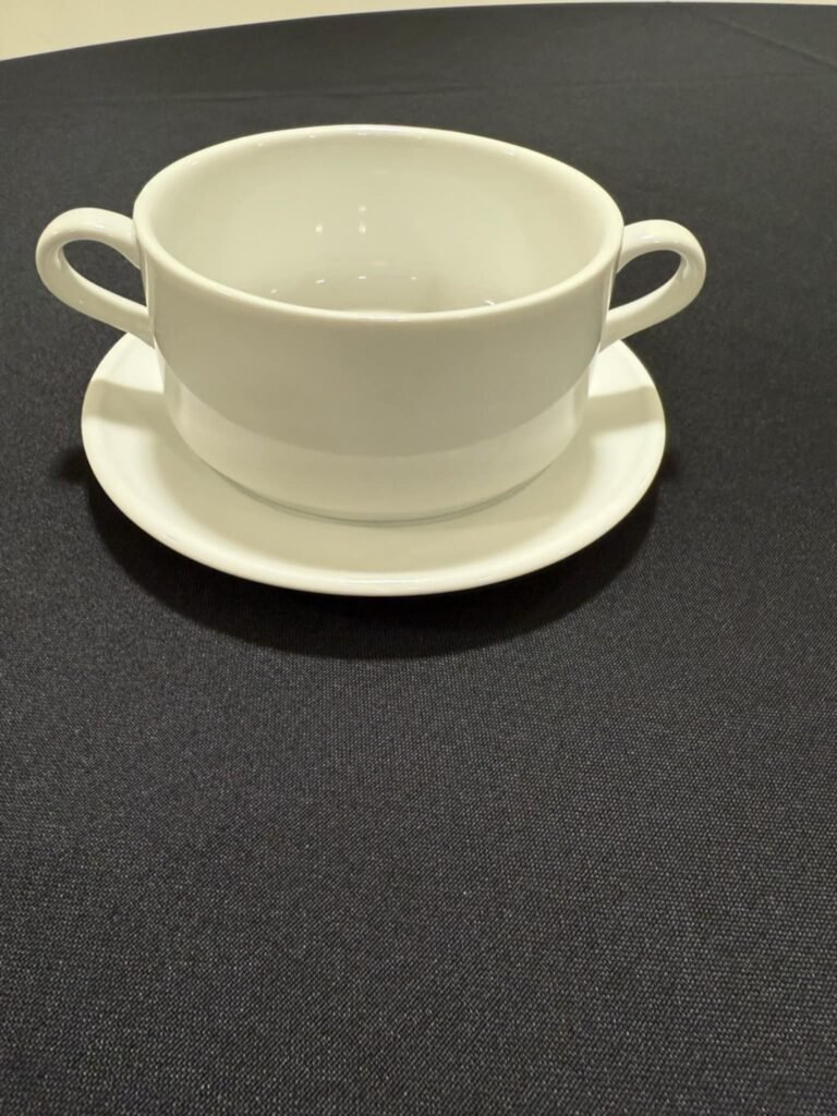 Elegancka bulionówka ze spodkiem, idealna do serwowania zup i przystawek, łącząca stylowy wygląd z praktycznym zastosowaniem. Cena: 1 zł Netto